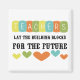 Multicolor text and hearts design reads "Teachers Lay The Building Blocks For The Future" on teacher inspirational T-shirts, mugs, bags, buttons, stickers, key chains, cards, and other items great for teachers, education professionals, or anyone who values teachers and education!