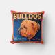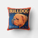 A vintage crate label print illustrating a bulldog with a blue patterned background and an orange border. Choose this art print on your Zazzle product today.
