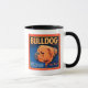 A vintage crate label print illustrating a bulldog with a blue patterned background and an orange border. Choose this art print on your Zazzle product today.