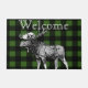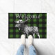 Bold buffalo check plaid pattern in green and black with a detailed black and white moose illustration and the word "Welcome" in a white open face font at the top centre.