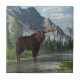 A bull moose stands in the ankle deep waters of a shallow, lazy river that winds its way through a forested valley. Fir trees and long grass line the banks of the rivers, while jagged rocky mountains enclose the valley. The moose looks back at you as if you've just interrupted him while he has a drink.