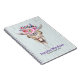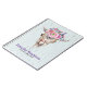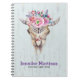 Watercolor bull skull with pink flower, buds and horns over light blue pattern background with arrows. Customisable notebook template