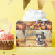 A watercolor-style painting of a cheerful dog sitting amidst a pile of vibrant fall leaves, surrounded by tiny pumpkins and scattered acorns. The dog wears a little pilgrim hat and beams with joy, capturing the spirit of Thanksgiving. In the background, soft harvest fields and golden-hued trees create a peaceful countryside ambiance. Gentle textures and warm, muted autumn tones give the scene a cosy, nostalgic feel perfect for celebrating the beauty of the season.
