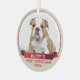 Bulldog Puppy 1st Christmas Red Ribbon Dog Photo Glass Ornament. The ornament is in red and beige colors. The name of the dog is on a red festive ribbon. You can use the ornament for any other pet. Great Christmas keepsake for you or a gift for your family and friends.