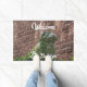 This Welcome doormat features the photographic image of a bulldog statue, commonly found around Savannah, Georgia, against a red brick background that's ideal for Bulldog fans, dog lovers and a classic traditional welcome with a fun twist. Customisable greeting and personalised Family Name.