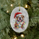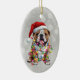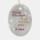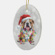 On the front of this Holiday ornament is an image of a brown and white Bulldog wearing a Santa hat and wrapped in coloured Christmas lights. The image is set against a festive silver bokeh background. The back of the ornament has the same background with custom text that currently says "Merry Christmas Happy New Year", the date and your signature. Cute for anyone, but especially for Bulldog fans.