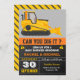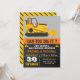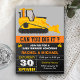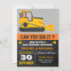 Amaze your guests with this cool construction theme baby shower invite featuring a yellow bulldozer and cute construction elements with modern typography on a chalkboard background. Simply add your event details on this easy-to-use template to make it a one-of-a-kind invitation. Flip the card over to reveal a vibrant yellow and black stripes pattern on the back of the card.