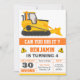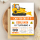 Amaze your guests with this cool construction theme birthday party invite featuring a cute yellow bulldozer with modern typography against a white background. Simply add your event details on this easy-to-use template to make it a one-of-a-kind invitation. Flip the card over to reveal a vibrant yellow and black stripes pattern on the back of the card.