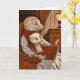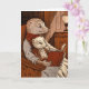 The image shows a warm scene of two ferrets, one adult and one young, sitting in a wooden armchair. The adult ferret, wearing a red and white scarf, holds a large book with a red binding, while the youngest, wearing glasses, is comfortably seated on his lap. The room is dimly lit by a lamp placed on a side table, throwing a warm glow on the stage.