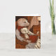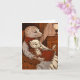 The image shows a warm scene of two ferrets, one adult and one young, sitting in a wooden armchair. The adult ferret, wearing a red and white scarf, holds a large book with a red binding, while the youngest, wearing glasses, is comfortably seated on his lap. The room is dimly lit by a lamp placed on a side table, throwing a warm glow on the stage.