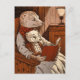 The image shows a warm scene of two ferrets, one adult and one young, sitting in a wooden armchair. The adult ferret, wearing a red and white scarf, holds a large book with a red binding, while the youngest, wearing glasses, is comfortably seated on his lap. The room is dimly lit by a lamp placed on a side table, throwing a warm glow on the stage.