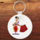 A bullfighter in the ring with the bull. The matador is holding a red cape. This design looks really effective on these Keychain