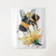 traditional watercolor artwork of a big bumble bee collecting pollen from a yellow flower as a decorative piece of wall tapestry