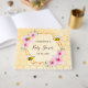 Elegant, fun summer baby shower celebrating a baby girl or gender neutral. Yellow, white background with a honeycomb pattern. On front: With a faux gold geometric frame. Decorated with pink tropical florals flowers, hibiscus and happy bumble bees. With the text: Baby Shower written with a modern hand lettered style script. Template for the the mummy to bee. Black letters.
