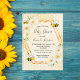 Elegant, fun baby shower invitation, gender neutral. Yellow, white background with a honeycomb pattern. With a faux gold geometric frame. Decorated with light pink tropical florals flowers, hibiscus and happy bumble bees. With the text: Baby Shower and the name om the mummy to bee on front written with a modern hand lettered style script.
