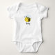 Cute fat yellow bumble bee with three black stripes and a black stinger. A happy smiling face and transparent blue wings. A template below makes it easy to add your baby's name by replacing the example name with your own.