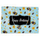 A pretty watercolor design featuring bumblebees and flowers over a blue background.