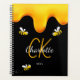 A stylish black background and happy smiling bumble bees. Decorated with sweet, golden honey dripping. Personalise and add your name, monogram initials, and year golden and white letters. The name is written with a hand lettered style script.