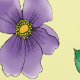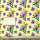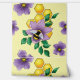 A cute bumblebee gently sits among two delicate lavender flowers and fresh green leaves, all set against a soft creamy yellow backdrop with yellow honeycomb design