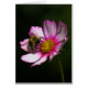 Bumblebee is on a pretty pink Cosmos daisy flower with green background.