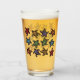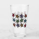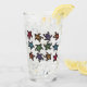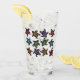 This glass tumbler for beverages has a bunch of black turtles with abstract markings on their shells witch are in a multitude of bright colours on the front and back.