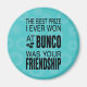 Modern typography style text for your Bunco best friend. Bunco dice sentiment reads: The best prize I ever won at Bunco was your friendship. Modular flower background accented with black text. Perfect gift as a Bunco prize.