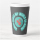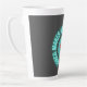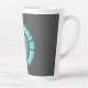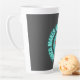 Those that love the game of Bunco will love this retro inspired latte mug design with red dice on a turquoise centre, neon aqua "Bunco makes my world go round" text on dark chalkboard grey background.