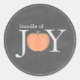 A baby shower sticker featuring an illustration of a pumpkin incorporated intro phrase "Bundle of Joy." Background is chalkboard inspired.