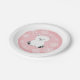 Baby shower paper plates featuring an illustration of a baby polar bear and snowflakes over a pink background. Personalise the name.