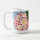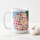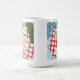 Charming, cosy Sunday brunch with friends. Cafe table flat lay with bundt cake and cappuccino coffee for two on a table with a red & white chequered table cloth. Monstera plants and traditional Spanish tiles on the floor. I'd love to see this design out in the wild; tag me on Instagram @parry_vegan