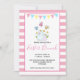 An easter brunch invitation on a pink striped pattern with a white frame layered over top. A bunting banner stretches across the top. An illustration of a mum and baby bunny standing together. Fresh springtime daisies in the background. Some whimsical butterflies fluttering above.