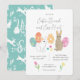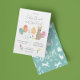Cute illustrated invitation for Easter brunch and egg hunt: with bunnies, painted eggs and tulips and spring flowers drawn by the store owner, Mònica Roca on one side. On the other side, an adorable Easter design with bunnies and flowers in turquoise and white.