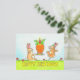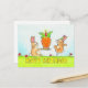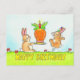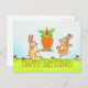 In the centre of this card two bunnies have come together, The one on the left is smiling and holding out a serving dish to the one on the right. On it is a birthday cake. A huge orange carrot is sticking out of it. It has a single red lit candle sticking out from the middle of its leaves. The second bunny is so overjoyed by the sight, he jumps in the air, spreading his little arms and laughing. He is wearing a colourful party hat. The bunnies are standing in front of a light blue background, on some light green grass, on which the words "Happy Birthday" are written in hand written yellow letters.