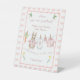 This Please Sign Our Guest Book Pedestal sign features a custom hand-painted frame of a crisp pink ribbon pattern accented with a pink scalloped border, creating a clean, classic, and welcoming look. A sweet watercolor clothesline is strung across the center, proudly displaying tiny, adorable items, each featuring a cute pink clothed bunny in a soft watercolor style. The scene is completed with cute fresh carrots, and bright, cheerful daffodils, all rendered in a soft watercolor style. Easily add your own details and change the font style, size color and placement if you would like to.