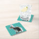 Bunny coaster on a blue striped background. The bunny is black and white and is computer enhanced.