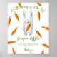 Gender neutral baby shower invitations. Featuring the saying 'A LITTLE BUNNY IS ON THE WAY!', an illustration of a watercolor bunny (rabbit) with carrot in paws, and many orange colour carrots. Matching items available.