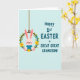 This card features a light pink bunny in a soft blue outfit, sitting cosily inside a green floral wreath with a gentle, affectionate look that feels like a family cuddle 🐰. The bunny’s long ears tilt slightly upward, with a tiny red nose and rosy cheeks that add a tender, friendly charm. The wreath is made from a brown vine ring and decorated with small yellow and pale blue flowers, tucked among leafy green sprigs like a springtime keepsake 🌷. A thin brown hanging cord at the top makes the wreath look suspended, as if it’s swaying lightly in the air. On the right side, teal lettering in large, easy-to-read capitals says “Happy 1st EASTER GREAT GREAT GRANDSON!” stacked across several lines. The text sits against a pale blue background with faint diagonal line texture, giving the layout a calm, airy feel beside the warmer pink and sunny yellow details. The bunny and wreath occupy the left half while the teal message fills the right, and the background remains softly patterned with diagonal stripes.