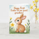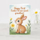 Designed with a gentle spring scene, this illustration features an upright, humanlike bunny as the main character, posed with a slight turn to the left as if noticing someone nearby 🐰. Its fur blends warm hazelnut and creamy ivory, with soft pink inside the long ears, a small pink nose, rosy cheeks, and a fluffy white tail. Large blue eyes catch the light, and the calm, tender look on its face adds a sweet, affectionate tone that suits close family or friendship. The background fades from pale blue into muted cream like an open sky, then settles into a grassy field of fresh green. Scattered across the grass are small yellow flowers and buds, adding a light springtime rhythm 🌷. Near the top, the greeting “Happy First Easter to our sweet grandson!” is centered in a warm-toned, flowing style of lettering that stands out clearly against the pale sky. Along the lower portion, the green grass forms a soft horizon line dotted with bright yellow blooms.
