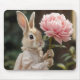 A charming rabbit is dressed in a delicate lace-trimmed dress and holds a large, blooming pink peony