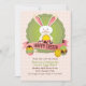 A white bunny hugs an Easter egg behind a "Happy Easter" banner. A sweet Easter invitation for any Easter celebration. (FP)