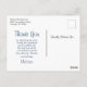 A party thank you postcard decorated with an illustration created with watercolors. A cute bunny rabbit wearing a blue dress sitting in a basket surrounded by her eggs. Butterflies flutter around the basket which is decorated with a fancy flower bouquet. Peach and white striped background. Personalised message on the back.