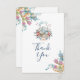 Party thank you card. Small rsvp sized card. Designed with an illustration created with watercolors. A cute momma bunny dressed in blue sitting in a basket surrounded by eggs. Butterflies and flowers around the basket. Tulip floral bouquets in the corners.