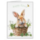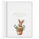 Adorable Easter Bunny sitting in a wooden basket filled with clover and Dandelion puffs. On the inside is a bunny sitting in a clay pot with violets.