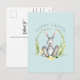 An adorable postcard for spring and the Easter Season, this watercolor illustration design features a cute bunny rabbit sitting in a floral wreath of spring daffodils, pussy willow, budding iris and leafy twigs and greenery. Whimsical "hoppy Easter" text on the front of the card can be edited with other text if you prefer. The background of this card is a pastel robin egg blue colour to carry out the spring theme. The back of the post card has been left blank for your personal message. You can also personalise this card as an invitation to a party, dinner, brunch, egg hunt or other activity by customising and adding your desired text.
