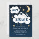 Sweet baby shower invitation card for your moon and stars themed party! Illustration of clouds with a bunny peeking her head out of one of them. There are texts inside the clouds that says "baby shower." There are gold shimmery moon and stars on a dark navy blue background. The baby shower party information follows. The texts are easily customisable online. This invite was designed for a baby boy shower. Illustration and design by Namibear Art Studio. ©Namibear
