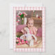 This charming 1st birthday party invitation features a cute little baby bunny holding balloons, and a pink gingham background. The reverse features the birthday girl's special photo. Designed by Thisisnotme©