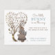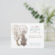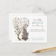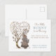 Whimsical cute woodland illustrated pregnancy announcement postcard features a bunny next to a sweet little tree, with a heart shaped canopy. Pregnancy postcard announcement in pastel blues and brown.