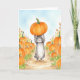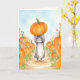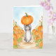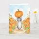 This greeting card features a watercolor portrait of a bunny holding a pumpkin over her head while walking through a pumpkin patch.