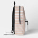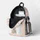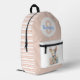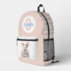 Sweet baby bag backpack done in soft blush, with graphics of a pretty toy bunny rabbit, on the pocket area. Blush and white stripes accent the solid blue front of the bag. Personalise the large one letter blush monogram and the blue name to suit your needs.