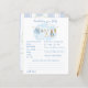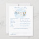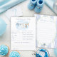 The Predictions for Baby and Baby Well Wishes game features a sweet watercolor clothesline strung across the top, proudly displaying tiny, adorable items, each featuring a cute bunny dressed in blue, with baby prediction questions and a space with advice for the parents to be. The back includes a space for Well Wishes for Baby with a custom hand-painted frame of a crisp blue vertical stripe pattern accented with a lush greenery wreath with a darling blue bow holding a bunch of fresh carrots all rendered in a soft watercolor style. Choose this fun activity which then becomes a special keepsake, every detail is crafted to be saved, tucked away in a baby book, and treasured for you and baby to remember the love of family and friends as he grows.